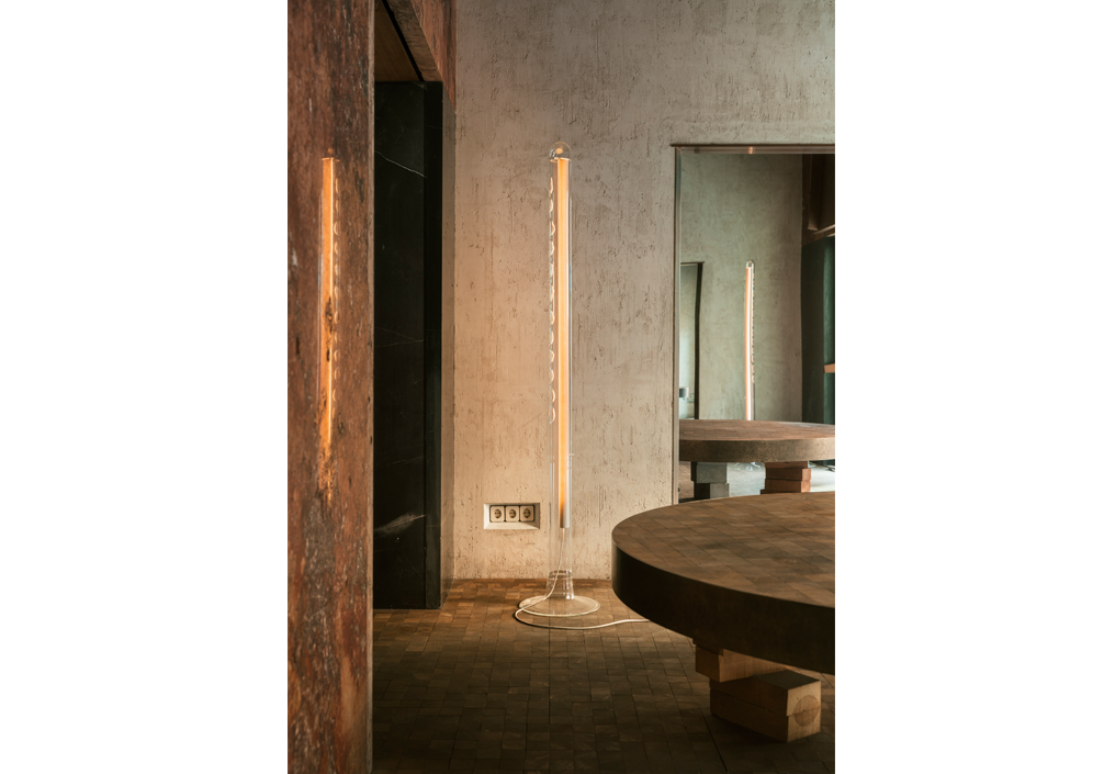 A line of light hangs suspended in the air, creating different reflections on the glass which vary based on the observer’s perspective. It’s a form of expression that speaks to us of light, transparency, delicacy and fragility.