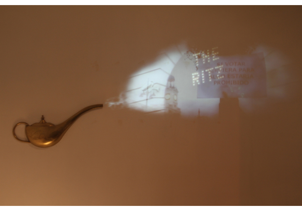 This piece consists of a brass sculpture attached to the wall next to a smoke-shaped video projection. Emerging from the lamp are distorted images of contemporary society, its injustices and imbalances.