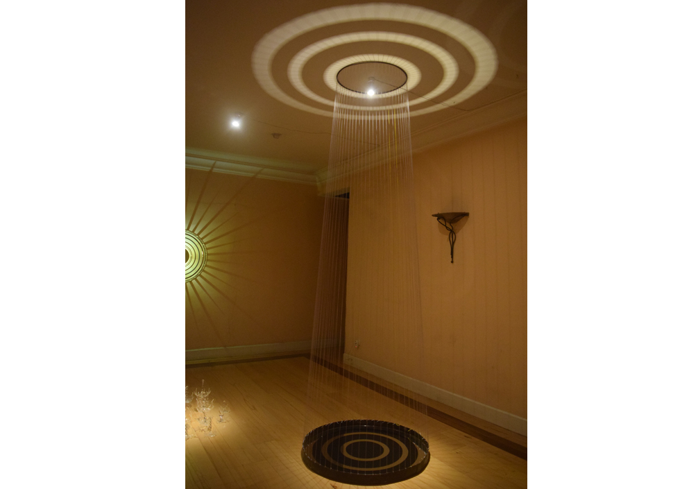 Sculptural installation featuring light, iron, mirror, water and textiles