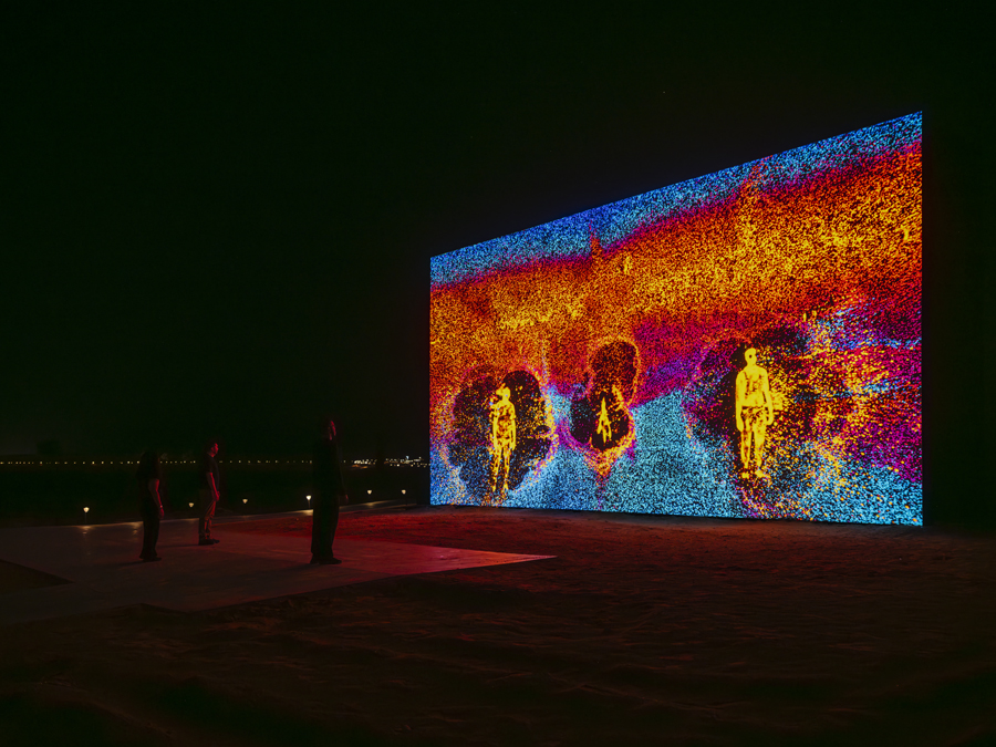 En Deriva Térmica, Rafael Lozano-Hemmer nos propone una instalación interactiva que visualiza la dispersión del calor corporal como emisiones de cuantos de energía que se alejan lentamente del participante. Utilizando una cámara termográfica y un sistema de partículas generadas por computadora, la obra revela la porosa frontera entre cuerpo y entorno y resignifica una tecnología habitualmente asociada a contextos policiales o militares, utilizándola como herramienta en un entorno participativo y cultural. Activa así una reflexión sobre la imagen, el poder y la presencia que sugiere que lo humano no termina en la piel, sino que mantiene un diálogo constante con la atmósfera que lo rodea.