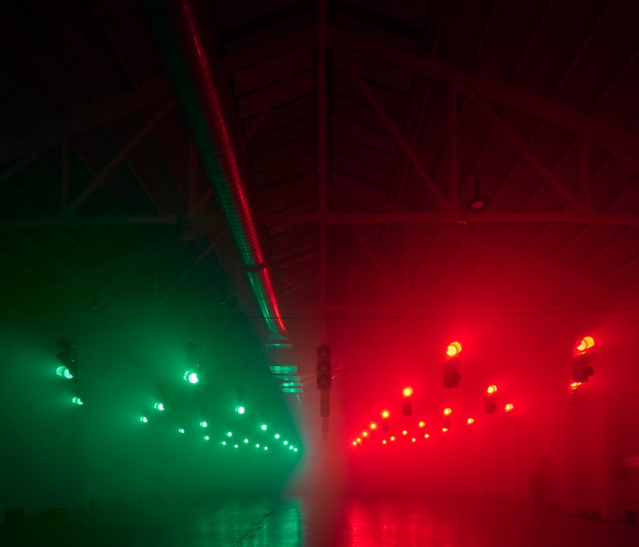 Una reflexión sobre cómo las señales que forman parte de la cotidianeidad del paisaje urbano pueden ser transformadas en una experiencia cultural. cabosanroque y Studio Animal convierten 49 semáforos en materia artística, liberándolos de su codificación como reguladores del tráfico y provocando que las tres icónicas luces se mezclen y jueguen con el ritmo sonoro hasta generar una paleta de gradiente infinito, en tránsito del rojo al verde. Se conforma así un espacio inmersivo que invita al espectador a sumergirse en un trayecto entre movimiento y quietud.